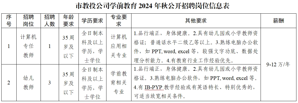 2024年秋季學前教育崗位招聘公告