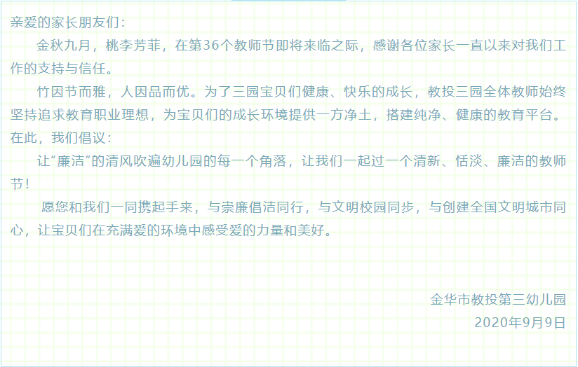 在第36個教師節(jié)來臨之際,金華市教投第三幼兒園向家長們發(fā)出了“立德樹人,廉潔從教”的倡議書,倡導清廉過節(jié)。